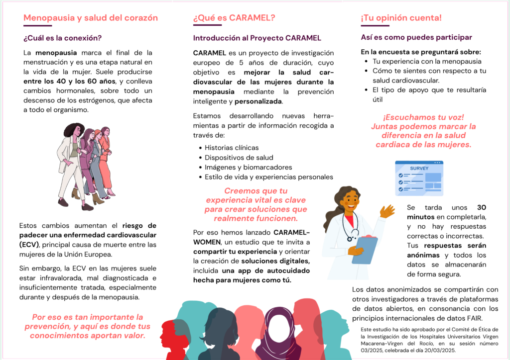 El Hospital Universitario Virgen Macarena (HUVM), el Distrito Sanitario de Atención Primaria Aljarafe-Sevilla Norte y la Fundación para la Gestión de la Investigación en Salud de Sevilla (FISEVI) invitan a un millar de mujeres, de entre 40 y 60 años, a participar en el estudio de investigación Caramel-Woman que tiene como objetivo comprender mejor cómo se expresa la salud cardiovascular en las mujeres en esta franja de edad, especialmente durante la transición menopáusica. Esta investigación, forma parte del proyecto Caramel, que cuenta con financiación del programa Horizon Europe y que persigue desarrollar estrategias de prevención personalizadas para las enfermedades cardiovasculares en mujeres en dicha franja de edad. Para ello, se ha elaborado una encuesta anónima que recogerá información sobre su salud general, estilo de vida y percepción del riesgo cardiovascular.